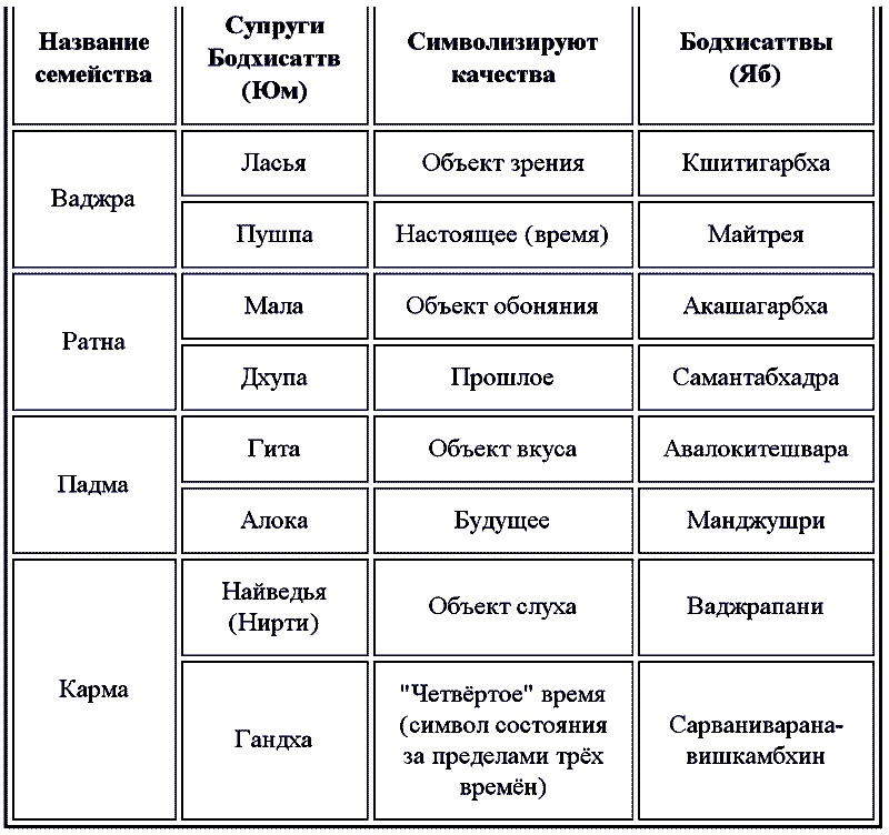 Название семейства 1. Ваджра 2. Ратна 3. Падма 4. Карма Супруги Бодхисаттв (Юм) 1.Ласья 1.Пушпа 2.Мала 2.Дупа 3.Гита (Ниртима) 3.Алока 4.Найведья (Гиртима) 4.Гандха Символизируют качества 1. Объект зрения 1. Настоящее (время) 2. Объект обоняния 2. Прошлое 3. Объект вкуса 3. Будущее 4. Объект слуха 4. «Четвёртое» время (символ состояния за пределами трёх времён) Бодхисаттвы (Яб) 1.Кшитигарбха 1.Майтрея 2.Акашагарбха 2.Самантабхадра 3.Авалокитешвара 3.Манджушри 4.Ваджрапани 4.Сарваниварана-Вишкамбхин Восемь бодхисаттв женского пола 1. Ласья ( 2. Мала 3. Гита 4. Найведья 5. Пушпа 6. Дхупа 7. Алока 8. Гандха Пушпу, Дхупу, Алоку и Гандху называют богинями подношений. Иногда их соотносят со временами года. Ласью, Малу, Гиту, Найведью называют чарующими богинями. Часто восемь бодхисаттв мужского пола называют просто: Восемь Бодхисаттв |