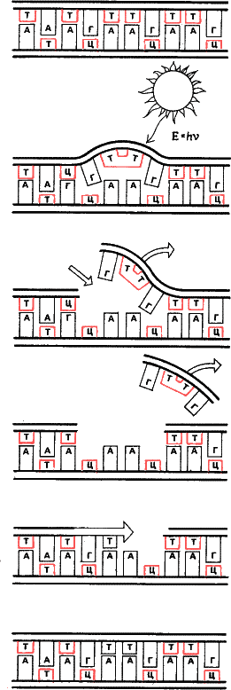 И тогда на помощь приходят ферменты-репаразы. Они выстригают кусок с повреждением, и в двойной нити ДНК образуется брешь. Матрицей для заполнения бреши служит сохранившийся кусок комплементарной последовательности, по ней строится участок взамен поврежденного и пришивается к старой нити особым ферментом-лигазой. Любопытно, что эта тонкая портняжная работа активируется светом, но не ультрафиолетовым, а более длинноволновым излучением, вплоть до инфракрасного (для человека – 300—600 нанометров). Так что с точки зрения охраны генетических программ гораздо полезнее греться у камина, чем загорать на пляже Репарация лечит также места, где из ДНК флуктуациями температуры и А если повреждение захватило обе нити? Здесь работа сложнее, но репарация справляется и с такими дефектами. Описаны случаи репарации, по крайней мере, части двунитевых разрывов и поперечных сшивок нитей ДНК. По-видимому, репарирующие системы исправляют не менее 99 процентов всех возникающих мутаций, делая жизнь вообще возможной. Тем самым вопрос о недостаточности мутаций для объяснения эволюционного процесса снимается: мутаций не много и не мало, а ровно столько, сколько их пропускает репарационный барьер. Почему же репаразы иногда не срабатывают? Во-первых, гены кодирующие их синтез, также подвержены мутациям. В таких случаях резко возрастает скорость всех прочих мутаций, особенно хромосомных разрывов («синдром ломкости хромосом»). Во-вторых, ни одна система, подобно наборщикам и корректорам суворинского издательства, не может работать абсолютно безошибочно. В-третьих, система репараз рассчитана на некий средний уровень помех, но ведь некоторые помехи подвержены флуктуациям и часть организмов неизбежно попадает в условия, когда репарация не справляется. К сожалению, в наших современных условиях, когда резко возрос радиационный фон, а воздух, вода и пища насыщены мутагенами система репараций работает на пределе. Самое страшное, что может ожидать (и сделать с собой) человечество – это термоядерная война. Ее наши репарационные системы, вне всякого сомнения, не выдержат. И поджигатели войны, если не захотят обречь себя на пожизненное заключение в атомоубежищах будут вынуждены выйти в обреченный на гибель мир, где даже крысы будут отравлены. В течение более чем трех миллиардов лет процесс эволюции создавал чудесный механизм, способный поддерживать свою структуру и передавать ее из поколения в поколение. Было бы чудовищным преступлением перед самой жизнью уничтожить его в считанные минуты ядерного катаклизма. В конечном счете применение ядерного оружия – война против будущих, еще не появившихся на свет поколений. И не только ядерного оружия. Вспомним одну из самых позорных страниц американской войны во Вьетнаме. Под предлогом уничтожения джунглей как убежища партизан американская военщина сбросила на многострадальную вьетнамскую землю около 80 миллионов литров ядов. Я не знаю формулы этого яда; известно только его условное название – оранжевый, «ориндж» – по цвету контейнеров. Но, по-видимому, это сильнейший мутаген из разряда супермутагенов – типа нитрозоэтилмочевины или же производных иприта. До сих пор тысячи километров вьетнамской земли остаются мертвыми, на них вырастают лишь уродливые, неизбежно погибающие деревья. В той или иной мере яд попал