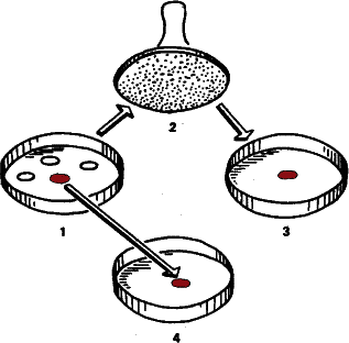 Американские исследователи Джошуа и Эстер Ледерберги исследовали процесс приспособления бактерий к антибиотикам. Этот феномен – проклятие современной медицины. Прославленные пенициллин, стрептомицин, олеандомицин быстро теряют свою эффективность Нужно сказать, что помогают микробам в данном случае и врачи со слабой биологической подготовкой. Они прописывают больным недостаточные дозы (из боязни «как бы чего не вышло»), то есть фактически ведут в популяциях бактерий отбор на устойчивость к антибиотику. Или же, наоборот, впадают в другую крайность и закармливают пациента антибиотиками при пустяковой простуде, а в результате тот же антибиотик окажется недейственным при двустороннем воспалении легких. Вспомните о переносах генов плазмидами и бактериофагами! Ген, определяющий, например, устойчивость бактерии к стрептомицину, легко может быть передан даже бактериям другого вида. В последнее время возникла серьезная проблема с гноеродными золотистыми стафилококками – современный врач с набором антибиотиков оказался в положении хирурга прошлого века, бессильного перед послеоперационными осложнениями. Выход в одном – все время обновлять арсенал антибиотиков, по возможности обгоняя бактерий. Но вернемся к Ледербергам. Они взяли несколько сот чашек Петри с питательным агаром и посеяли на них культуру бактерий, чувствительных к антибиотику. На тех местах, где на поверхность питательного студня попадали бактерии, эти бактерии начинали расти, делиться, и через некоторое время агар покрывался колониями, скоплениями бактерий, выросших из одной клетки-родоначальницы. Исследовали сразу сотни и тысячи колоний, что увеличивало шансы на обнаружение редко наблюдаемого эффекта. Затем Ледерберги запаслись несколькими сотнями штампов – кружков, равных по диаметру чаше Петри и обтянутых бархатом. Штампы стерилизовались в автоклаве, чтобы не занести в культуры чего-нибудь лишнего. Затем стерильный штамп прикладывался к поверхности агара; в каждой колонии часть бактерий прилипала к ворсинкам бархата. А затем штамп прикладывался к поверхности агара в другой чашке. Но этот агар уже содержал антибиотик, причем в концентрации, смертельной для данных бактерий. И «отштампованные» на его поверхности колонии бактерий перестали развиваться и погибли. Но была подмечена любопытная закономерность: если колоний достаточно много, среди них обязательно найдется хотя бы одна, которая приживется на ядовитом агаре и будет разрастаться, как ни в чем не бывало. Казалось бы, ясно: произошло направленное целесообразное изменение по Ламарку или же Бергу. Правда, неясно, почему приспособилась лишь одна колония из многих, но это уже деталь. Но колонии переносились на агар с антибиотиком штампами с сохранением прежнего положения. Поэтому мы всегда можем найти материнскую колонию и убедиться, что она также состоит из бактерий, устойчивых к антибиотику! Приспособление возникло до того, как на популяцию подействовал фактор– антибиотик Налицо явное нарушение принципа причинности. Следствие предшествует причине. Но если мы примем, что подобные изменения генетических программ возникают в результате чисто случайных процессов и в некоторых случаях оказываются полезными, никакого нарушения не будет. Но это уже не ламаркизм или номогенез, а отбор случа