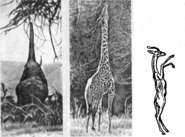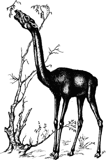 Этот удачный тип строения был использован эволюцией не один раз. В миоценовом периоде в Северной Америке обитали жирафоподобные верблюды – альтикамелюсы. А в Сомали, в самых жарких и бесплодных местностях, и сейчас благоденствует удивительная жирафовая газель (она же геренук, или антилопа Уэллера). У нее длинная шея и ноги; кроме того, геренук может объедать листья на высоком кустарнике, стоя на задних ногах.